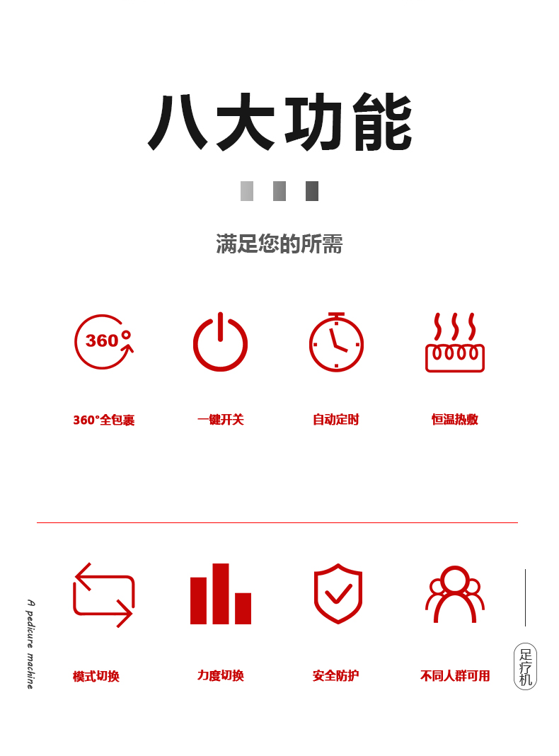 底壓機(腳趾),刮板(鞋底),Shiatus(腳跟)按摩(多模式,多強度)