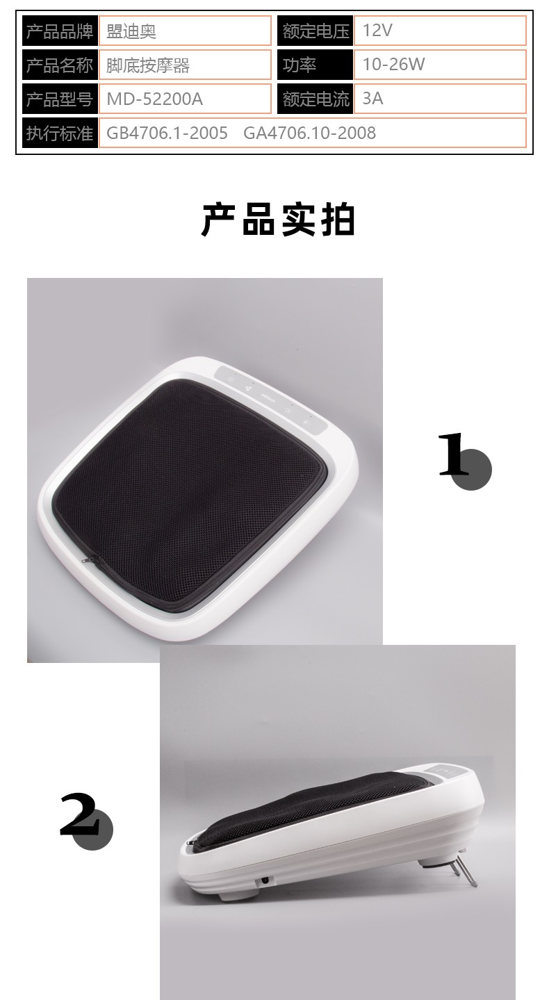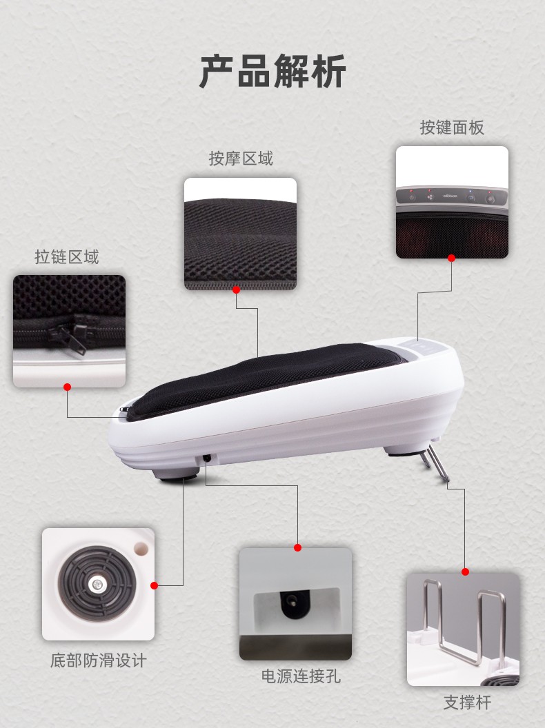 功能特征:腳底六個按摩頭,三檔力度調(diào)節(jié),按摩頭正反轉(zhuǎn)/紅綠燈轉(zhuǎn)換,按摩頭加熱,冷風(fēng)降溫,15分鐘定時,可拆洗腳套,按鍵控制面板