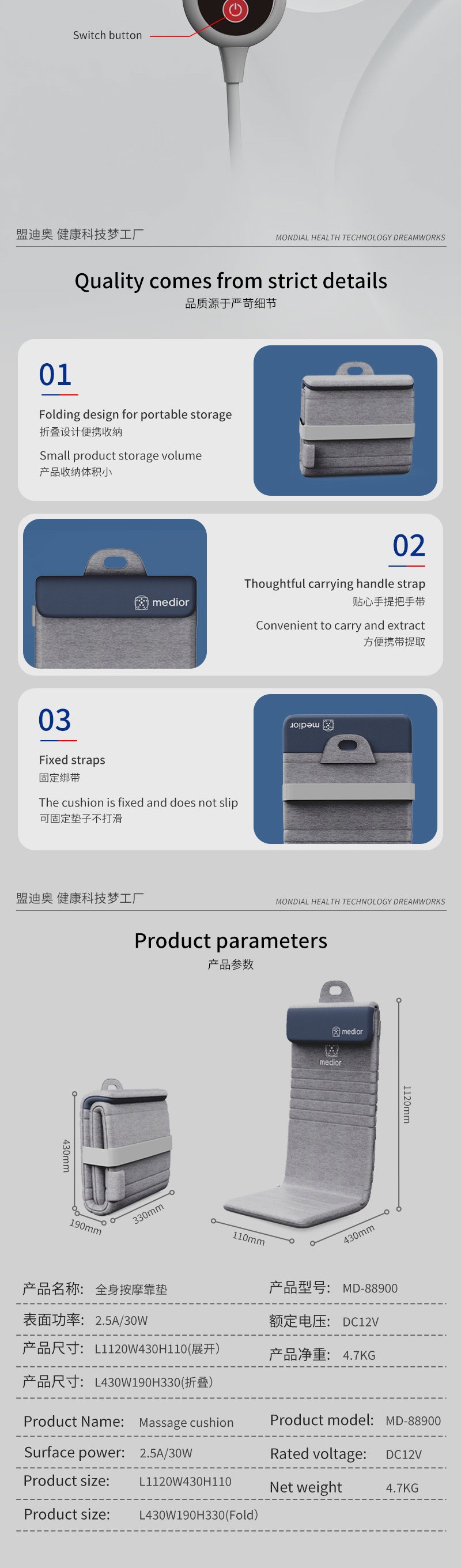 1、L型機(jī)芯結(jié)構(gòu),對(duì)折包裝縮小體積2、獨(dú)家專利柔性機(jī)芯3、力度三檔調(diào)節(jié),定點(diǎn)按摩,腰背按摩、臀腿按摩、全背按摩模式選擇4、背部行走揉捏,按摩區(qū)域加長(zhǎng)到從肩膀到大腿;5、更加貼合不同款式的椅子整體可對(duì)折收納