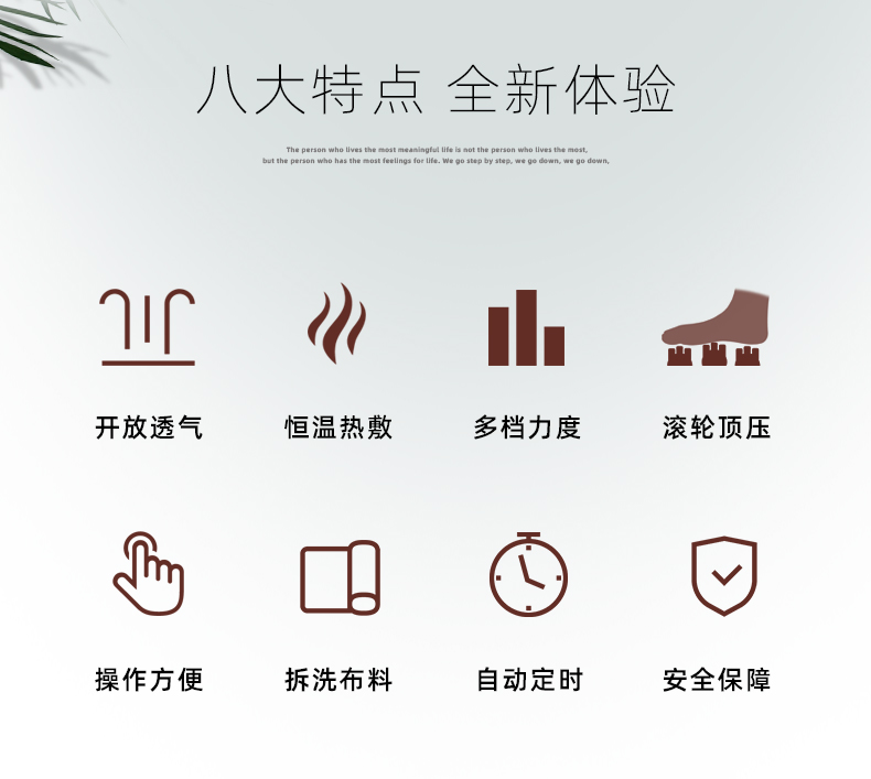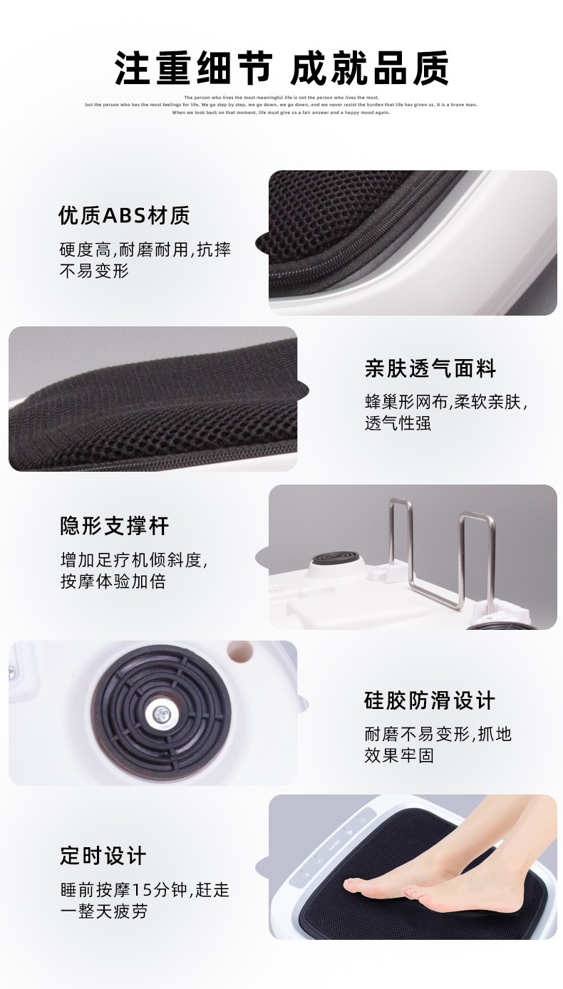 功能特征:腳底六個按摩頭,三檔力度調(diào)節(jié),按摩頭正反轉(zhuǎn)/紅綠燈轉(zhuǎn)換,按摩頭加熱,冷風(fēng)降溫,15分鐘定時,可拆洗腳套,按鍵控制面板