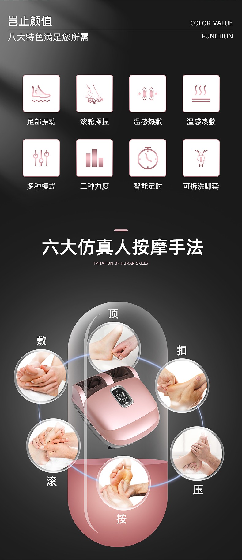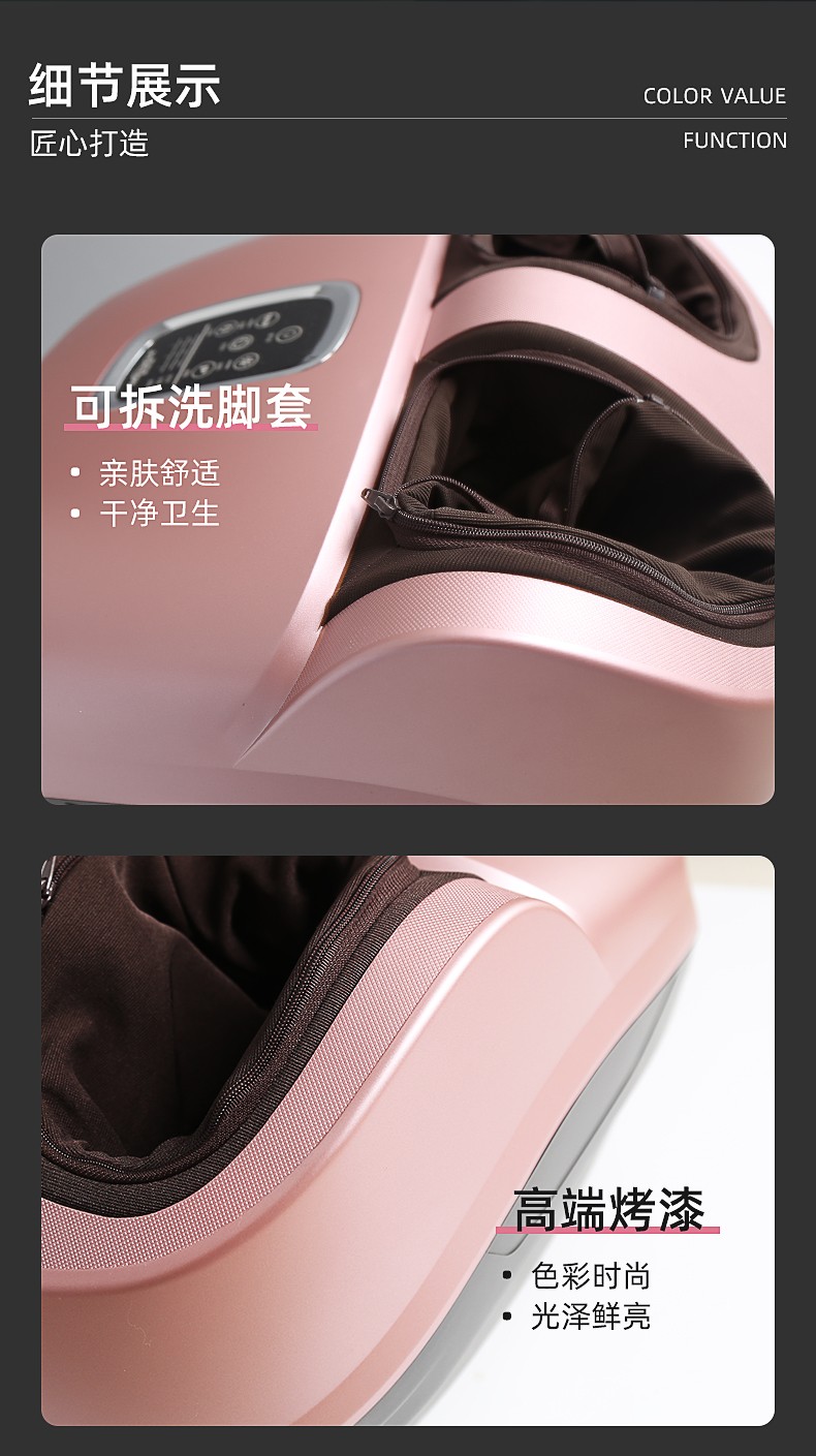 滾輪按壓(腳趾)、刮痧(腳弓)、捶打(腳后跟)按摩 (多模式,多強(qiáng)度);